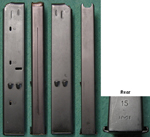 logo on one side and a line indicating the type of mag inside on the