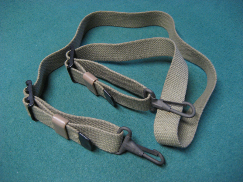 carbine sling, but with tan plastic keepers and metal clips at either